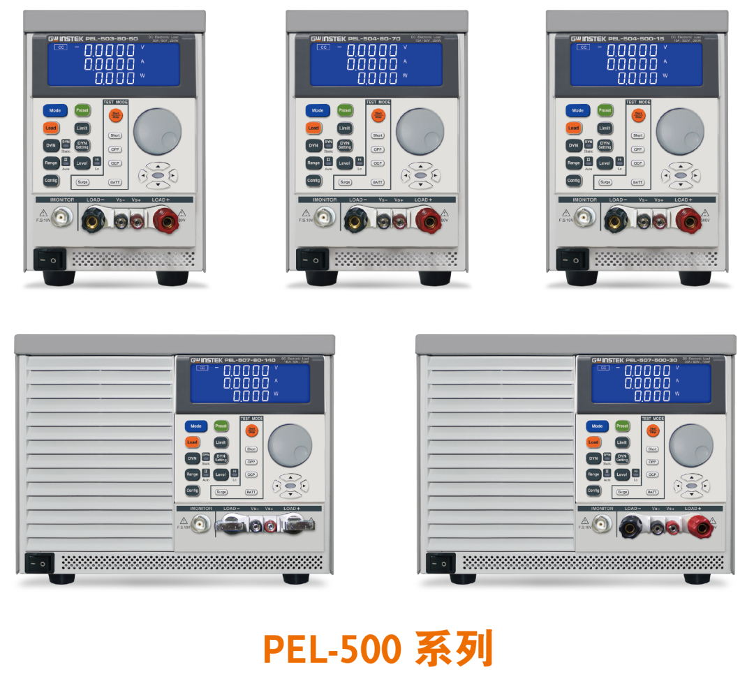 PEL-500 系列單通道電子負載,共有5個型號分別提供0~80V/0~500V電壓操作范圍及250~700W的功率操作范圍。可以應用于研發(fā)、品管、ATE系統(tǒng)及生產(chǎn)測試,包括電壓源/電流源測試、開關電源瞬時響應、定電壓模式供限流測試及模擬電池、電池放電測試、電池充電測試。